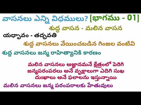 (01:30) ఆ వీడియో చూడండి ఆ డీటెయిల్డ్ వీడియో అందరికీ అర్థంఅవ్వడం కోసం డీటెయిల్డ్ గా చెప్పడం జరిగిందండి. అది చూసి ఈ వీడియోకి రండండి ఇంకా క్లియర్ గా మీకు అర్థంవుతుంది. సరేనా అండి. ఇప్పుడు మనము విషయంలోకి వెళ్దాము. వాసనలు ఎన్ని రకాలు వాసనలు అంటే మనసుపై పడే ముద్రలు అని చెప్పాను కదండీ ఈ వాసనలు ఎన్ని రకాలు రెండు రకాలుండి దీనికి యోగ వాశిష్టం చెప్తున్నది అండి వాసన ద్వివిధా ప్రోక్త శుద్ధ మలినా తథ